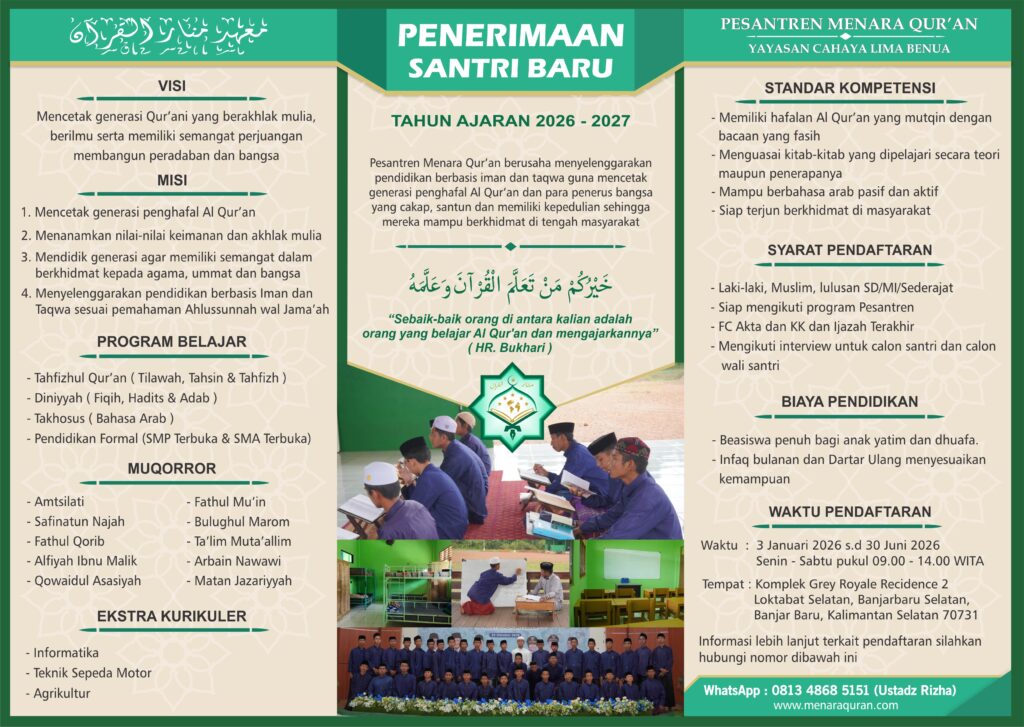 Alhamdulillah Pesantren Menara Qur’an kembali membuka pendaftaran utuk calon santri angkatan ke 4, berikut kami lampirkan brosur penerimaan santri baru Tahun Ajaran 2026-2027